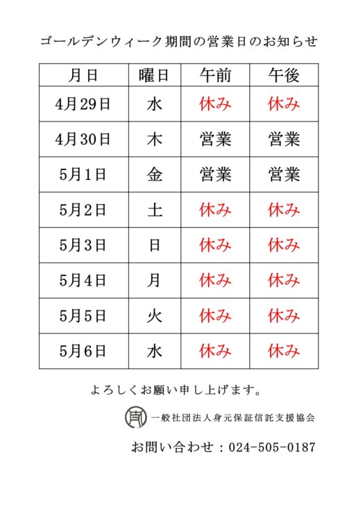 ゴールデンウィーク期間の営業日のお知らせ
